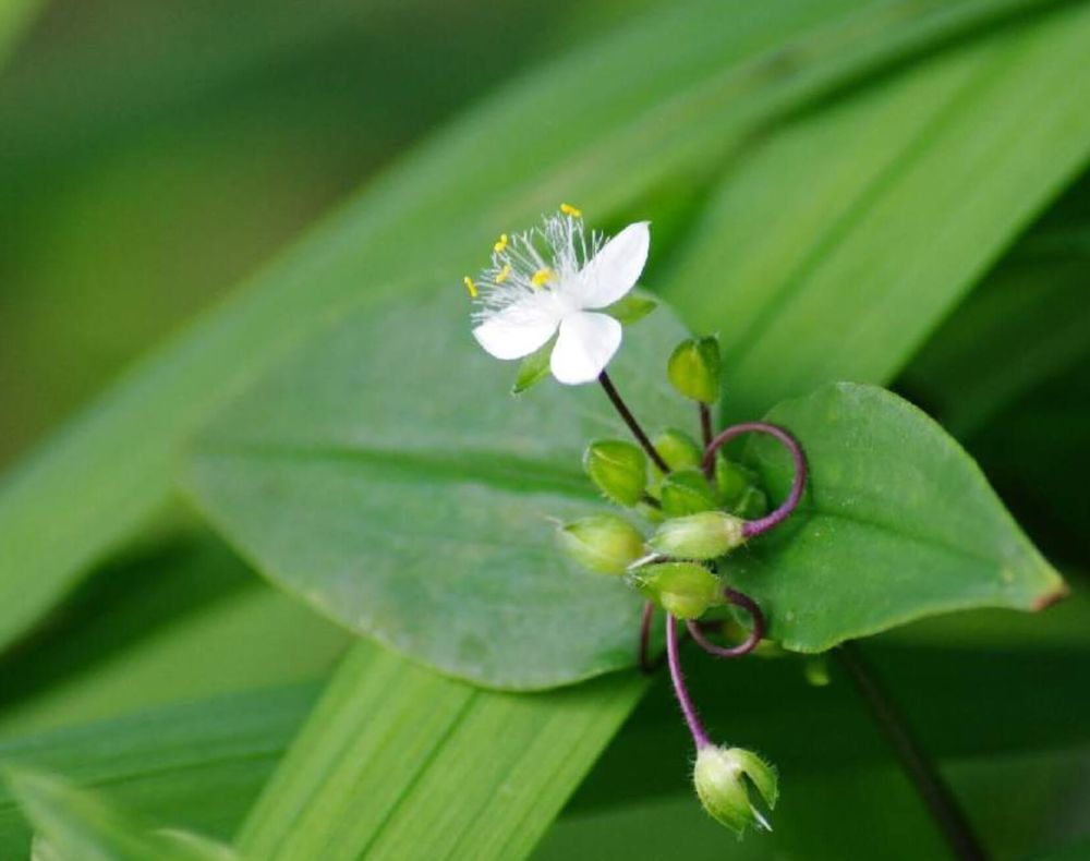 ミドリハカタカラクサはツユクサ科ムラサキツユクサ属の植物で、茎、花柄、葉の裏が緑色をしています。トキワツユクサ同様白い花を咲かせ3枚花弁です。