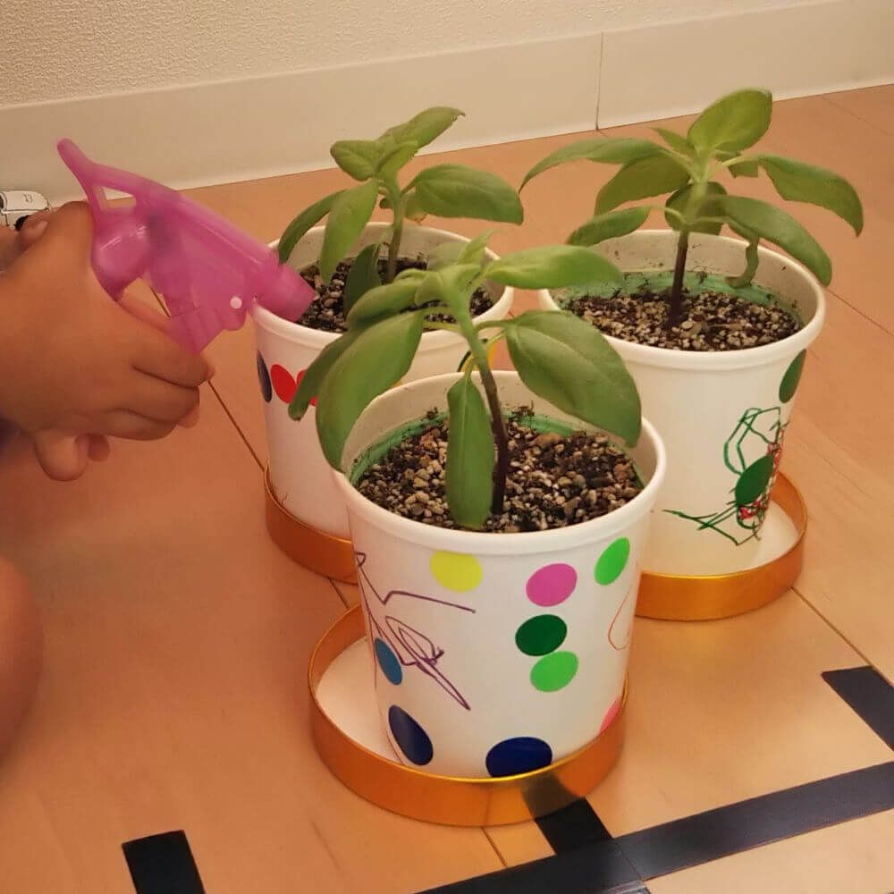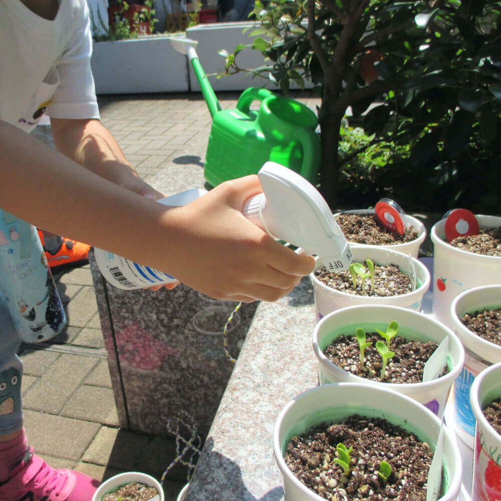 霧吹きやペットボトルなどを使って、子供たちが水をあげやすいように工夫されてますね!