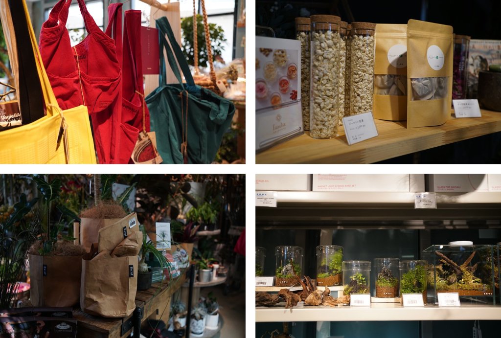 ビーツなどの植物で染めたVegieBAGなど、ナチュラルなグッズも充実。暮らしを豊かにしてくれるアイテムで溢れています。湿地帯の環境を再現したテラリウムや、GreenSnapが作ったリサイクル素材の鉢カバー「Re:af®︎」も販売中♪ショップを訪れた際にはぜひ手に取ってみてください。