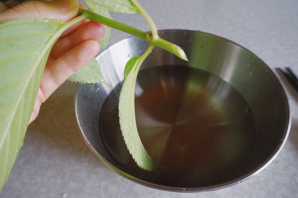 紫陽花は花が大きいため普通の切花よりも水切れしやすい特徴があります。葉っぱから水が蒸発してしまうと、茎からたくさんの水を吸わなければなりません。水を吸うことに労力を使うと早く萎えてしまう原因にもなるため、必要のない葉っぱは全て切りましょう。