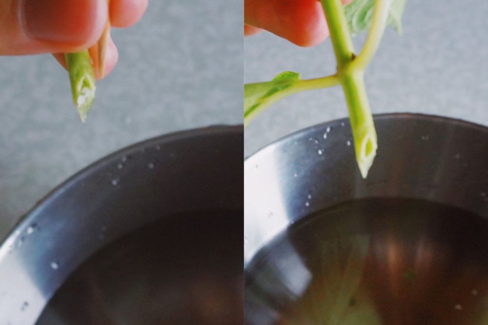 水をとりかえるタイミングなどで再び茎の水切りを行い、切り口を新しくします。少し面倒かもしれませんが、1、2、の処理を繰り返すことで水の吸い上げを良くすることができますよ。切花を購入された場合も、この処理を行うことで花が長持ちします。