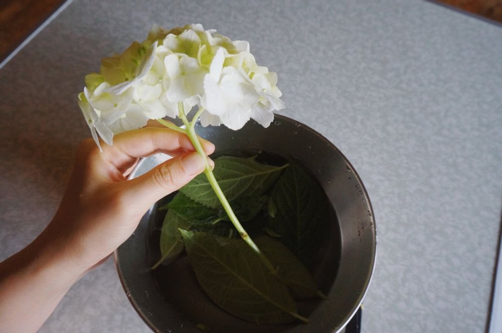 紫陽花の茎には”ワタ”と呼ばれる白い繊維が詰まっています。ワタには道管が通っておらず、水の吸い上げを妨げるため、ハサミの先や爪楊枝などで取り除きます。その後はしばらく水に入れて休ませましょう。