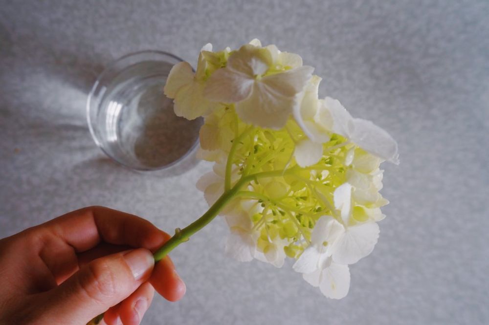 茎が萎えてきたら、紫陽花の房の部分から大胆に短くカットしてみましょう。花へたっぷりと水を届けることができるので、花を最後まで長く楽しむことができます。房の部分にはワタがないので、水切り後はそのまま飾ってOKです。