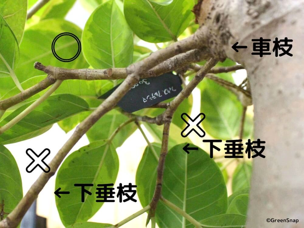 たとえば、上の写真のように、1箇所から3本以上の枝が伸びている部分を車枝といいますが、この場合うち2本が下向きに伸びる下垂枝なので、真ん中の1本を残して、サイドの2本は根本から剪定するといいです。