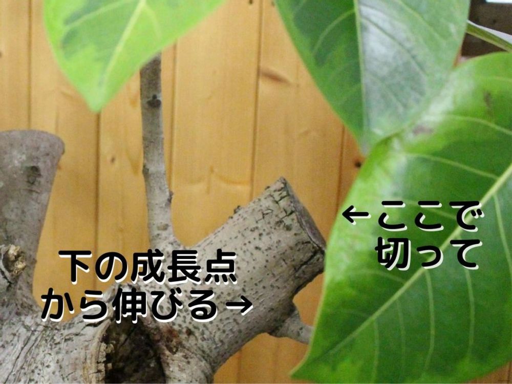 強剪定ではどこを切るかというと、成長点の2〜3cm上です。ゴムの木の成長点とは、幹・枝からボコっと出っ張った部分です。ここで剪定すると、それ以上に伸びることもなく、切り口より下の成長点から新しい芽が伸びます。