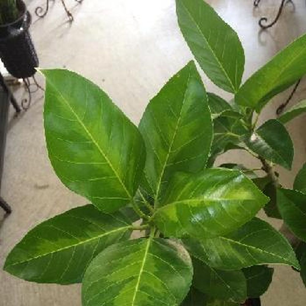 葉の形がたまご型をしていて葉の周りに黄緑色のまだらが付く観葉植物のアルテシマ。
