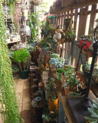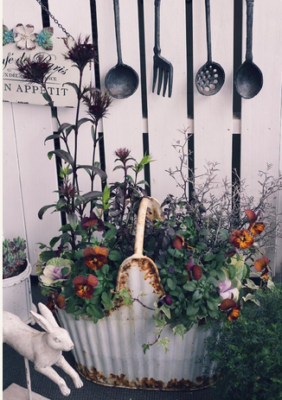 お花の寄せ植えも、アンティークカラーでバランスよく仕上げています。