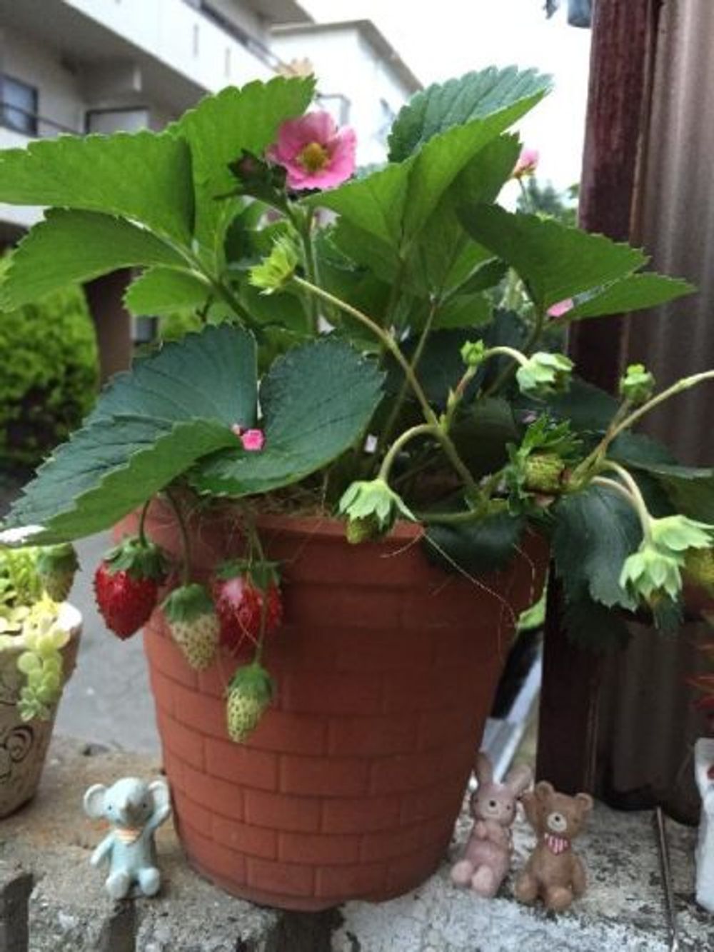 いちごは、多年草でツルを植え付けて育てます。実をつけるのが難しい植物です。
