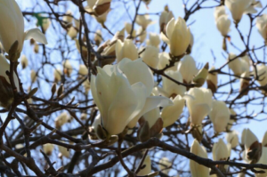 ハクモクレンは遠くから見ると、その花の咲き方の特徴から、まるでたくさんの白い小鳥が枝にとまっているように見えます。