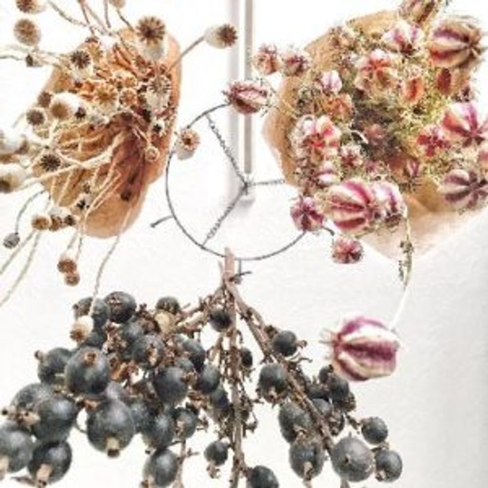 吊り下げられるアイテムを使って、ドライフラワーや実ものをハンギング。照明用のレールを使うアイディアも見習いたいですね!