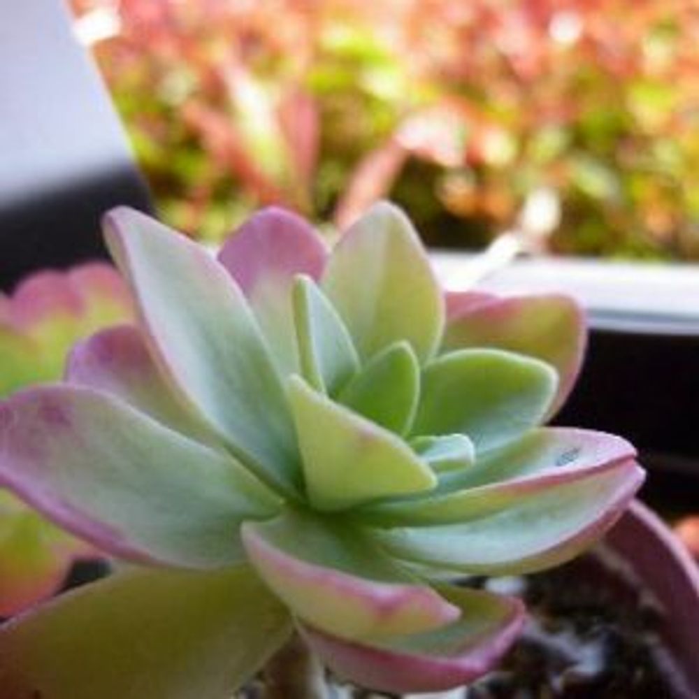 グリーン色だった葉っぱの縁が、紅葉時期になるとほんのりピンク色に染まる「薄化粧」。その名の通りに、多肉植物がほんのりとお化粧をしているようです。