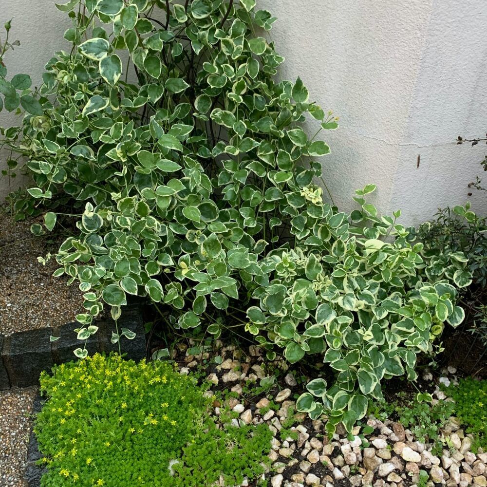 お庭の地面に直接植えても、緑の絨毯みたいに広がっていて素敵です。暗くなりがちなコンクリートの壁には、常緑のつる性植物があるとありがたいですね。