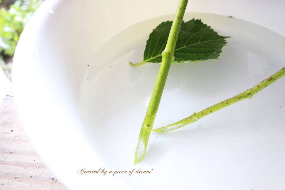 バケツに水をくみ、水の中で紫陽花を 丁寧に。