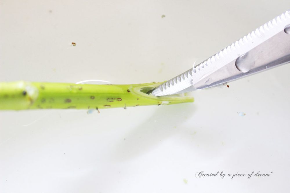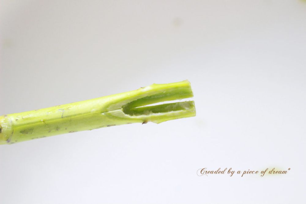 そのあと、半分に切込みをいれると、より水の水あげがよくなるようです。