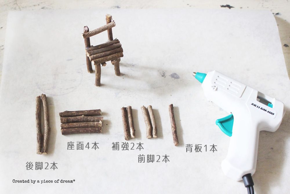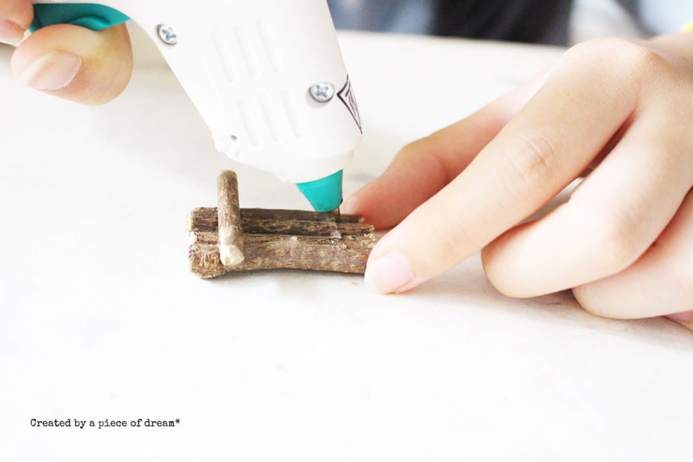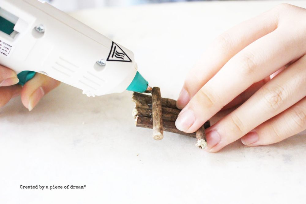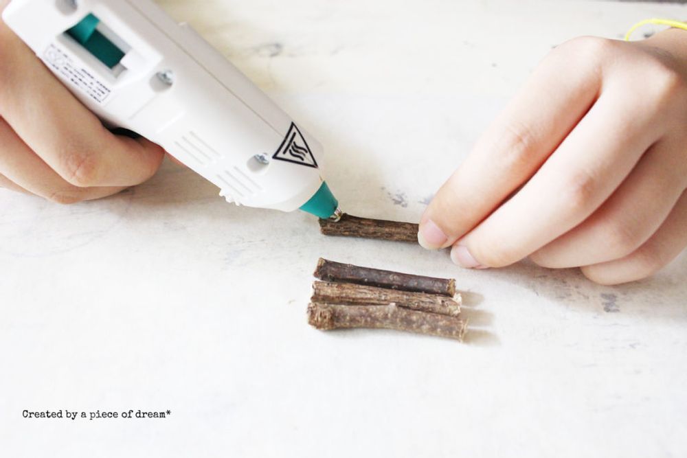 グルーガンを熱し固形接着剤を溶かしながら、小枝を4本、接着していきます。