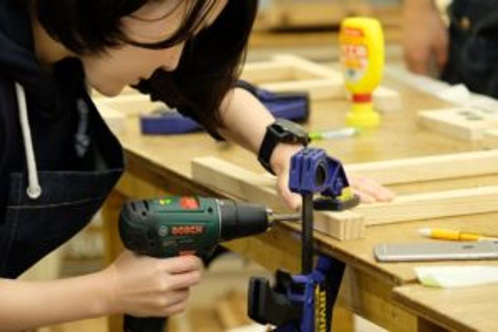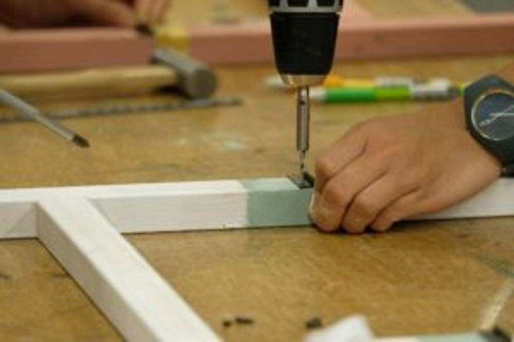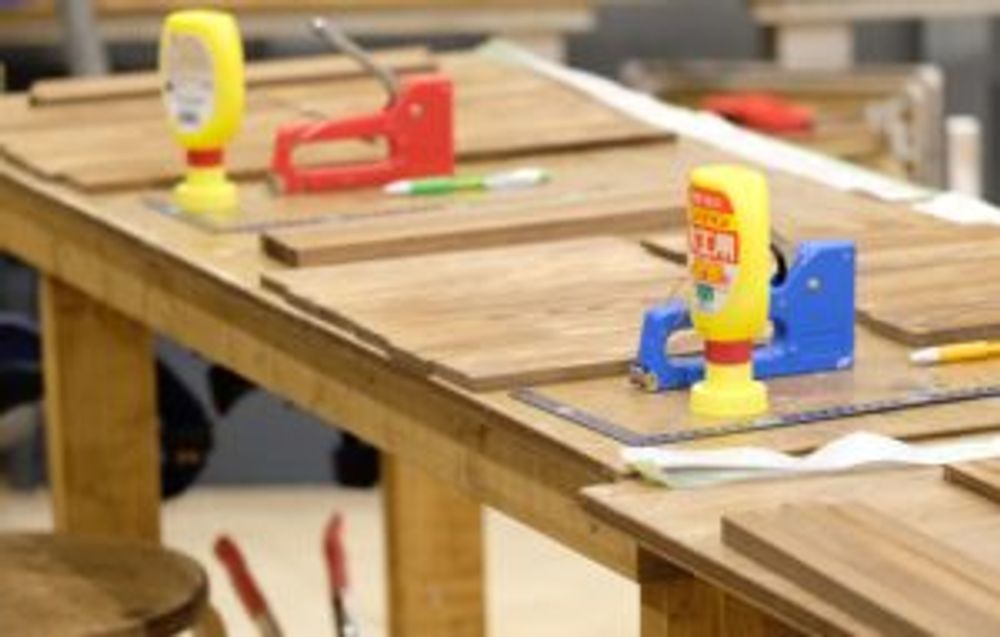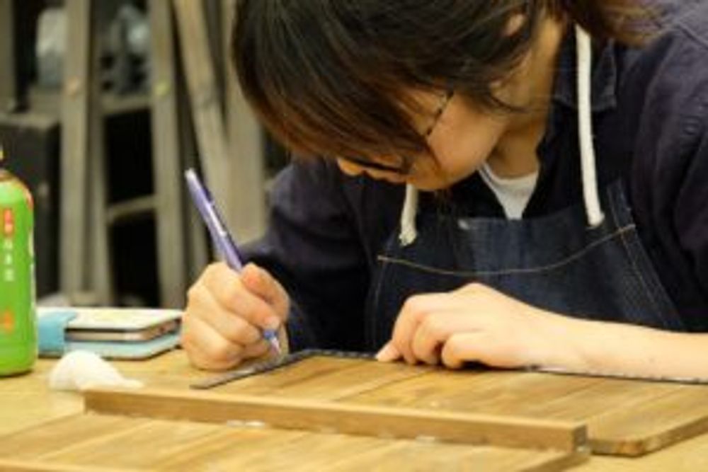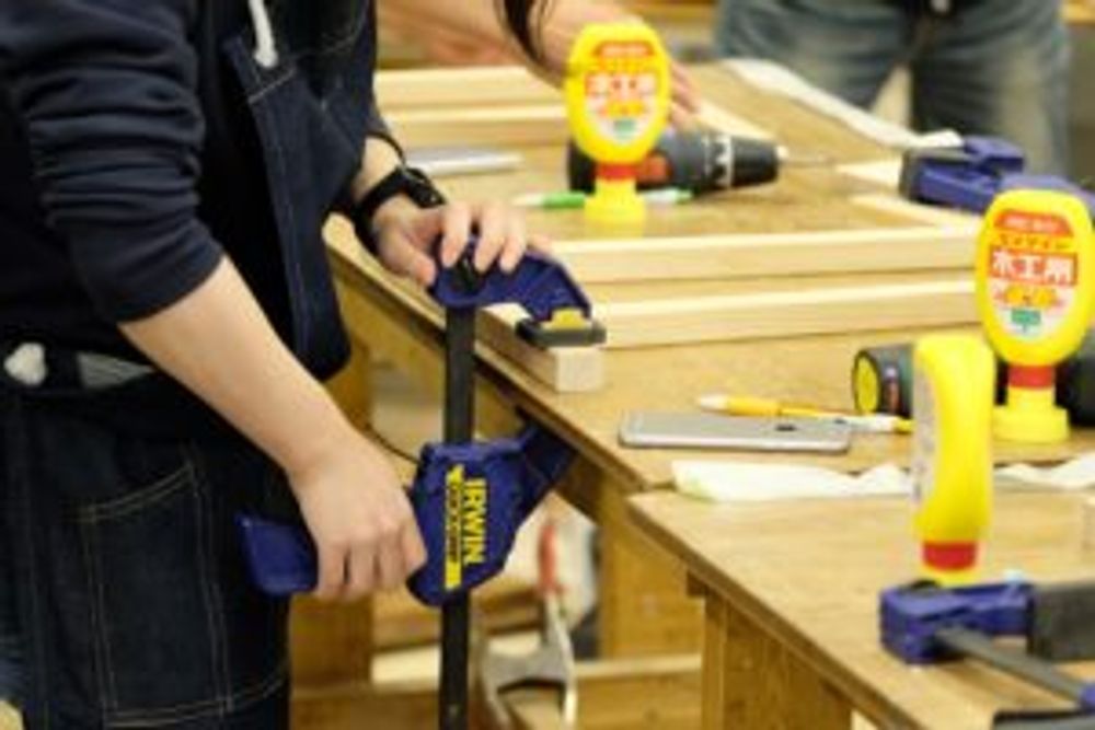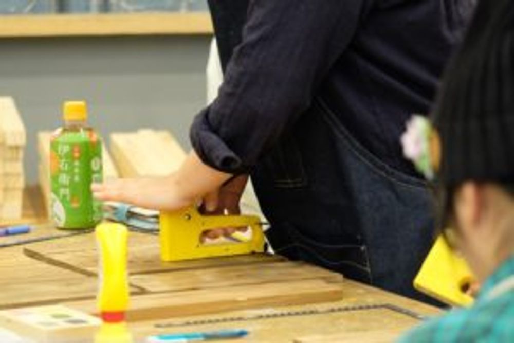手のひらサイズの長方形板を数枚繋げるために、DIY用の工具でホッチキス止め。