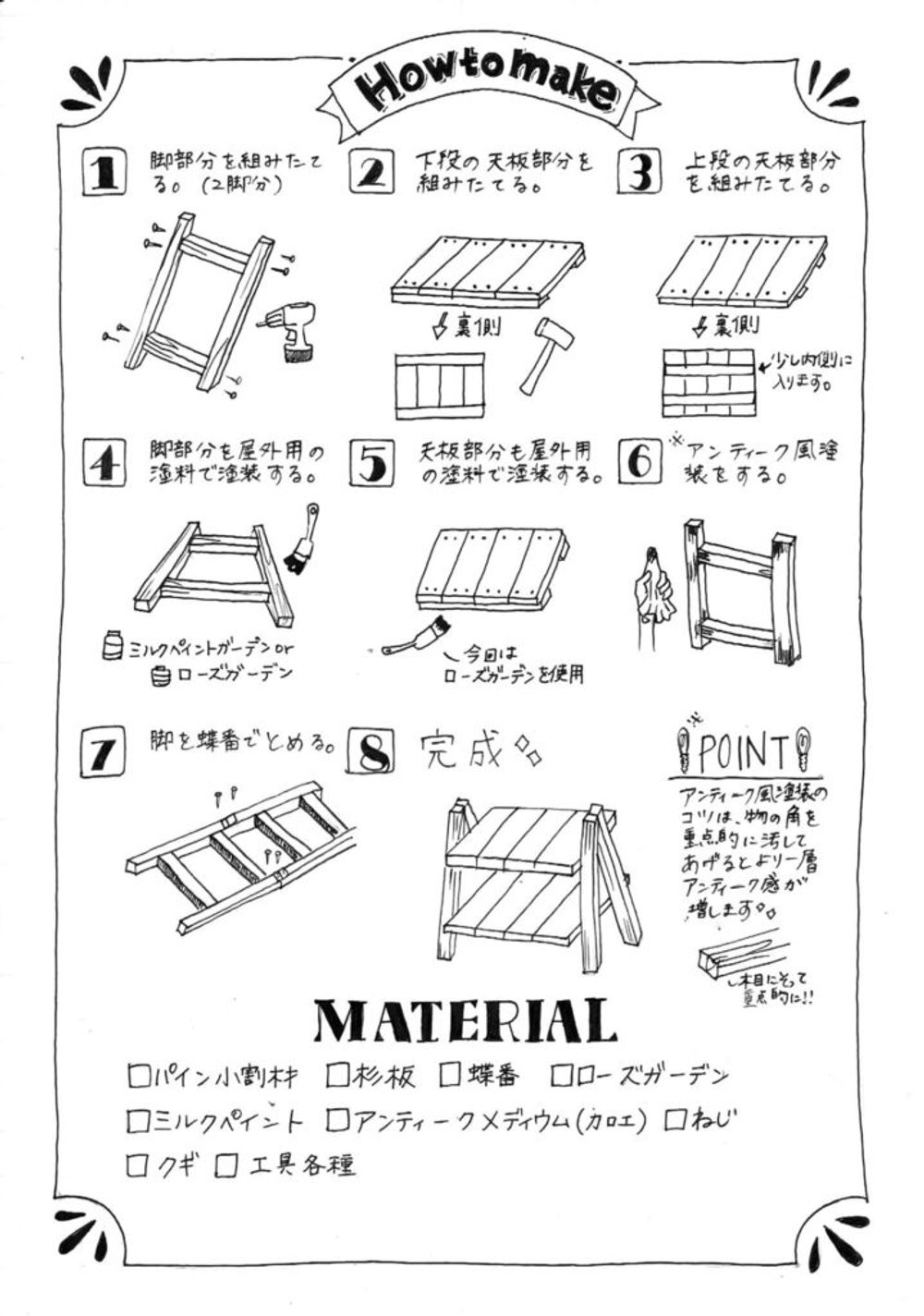 アンティーク調の塗装ポイントは、物の角を重点的に、木目に沿って汚していくとより一層アンティーク感が増していきます。