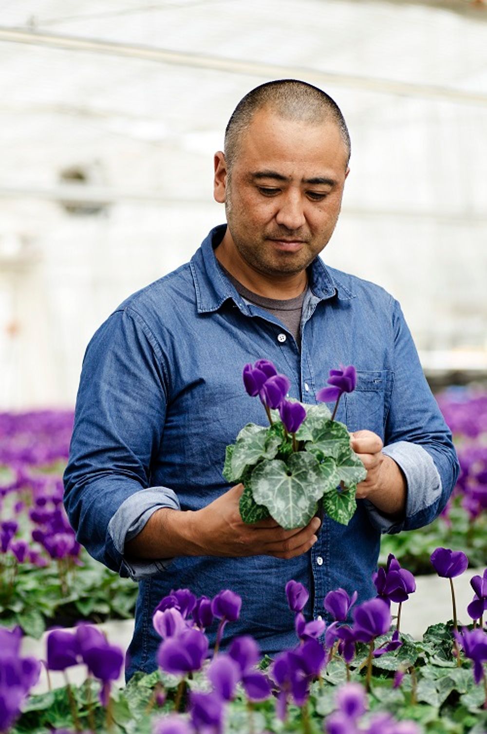 生産歴は17年。ハウス3000坪、露地3000坪の農園で、自社育種のシクラメンやアジサイを中心に、ブロメリア、チランジア、ユッカなどの観葉植物も生産。カフェ併設の直売所「Botanical & Café Breed」も経営し、消費者の声をいち早く新しい品種の育種や生産に取り入れることで、常に話題性のあり、消費者に喜ばれるスペックの鉢花を作り続けている。