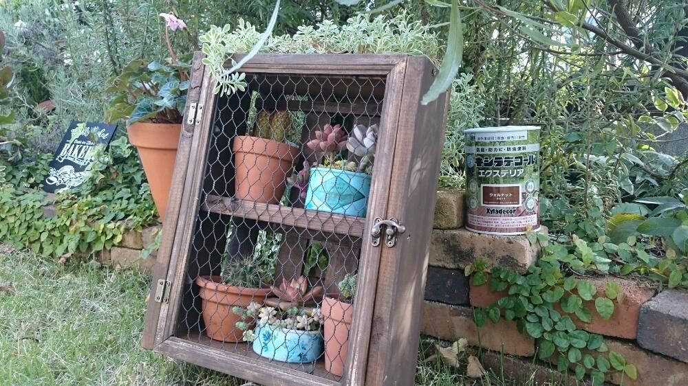 soraさんは、100均のフォトフレームとチキンネットを使ってオシャレな扉付きの多肉棚をDIY。