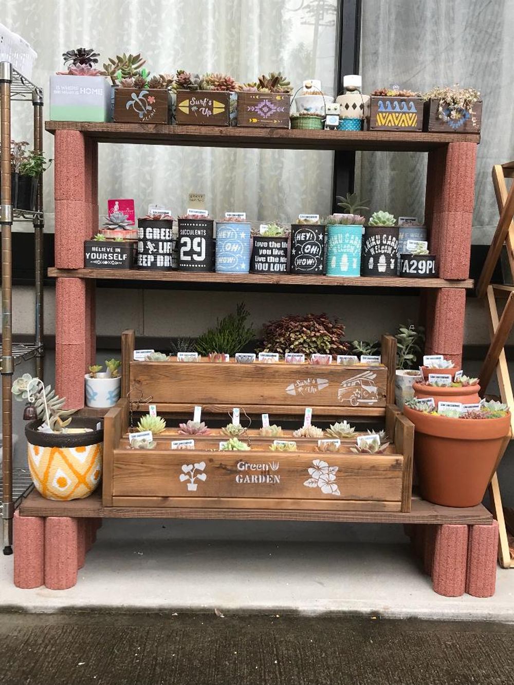 YUKIさんは、釘もネジも使わないで作れる多肉棚と、ステンシルで飾った棚をDIY。