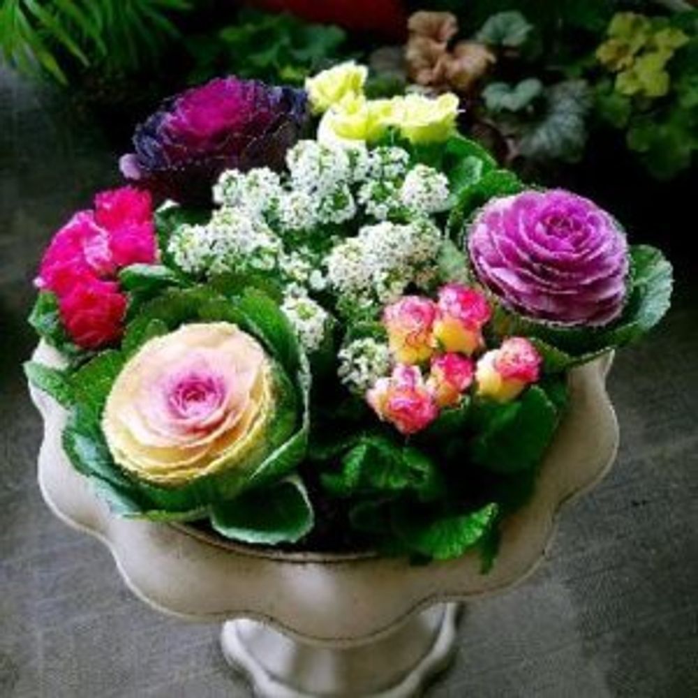 三色の葉牡丹を中心に、ピンク系のプリムラや白いアリッサムを配置。プリムラは寒さにも強く、カラフルでバリエーションも豊富なので、冬の寄せ植えにはおすすめのお花です。