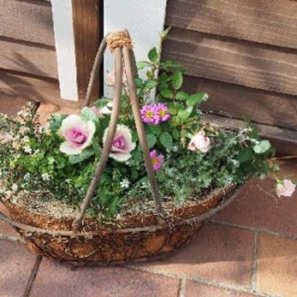 バスケットタイプの籠に寄せ植え。葉牡丹やブラキカム、グリーン系の植物で、ナチュラルに仕上げています。