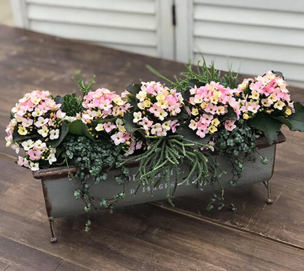 かわいく華やかで窓辺にぴったりです。奥行きがない場所には横長の容器を使いましょう。