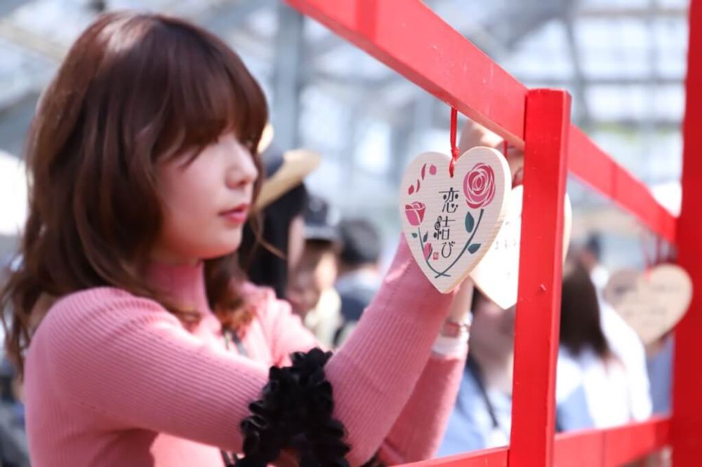 園内には、恋愛成就の「恋結び絵馬」も登場!かわいいハートのデザインが目印。両思いになりたい、素敵な出会いが欲しい、結婚して幸せな家庭を…など、叶えたい願いを絵馬に託して。