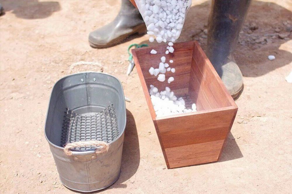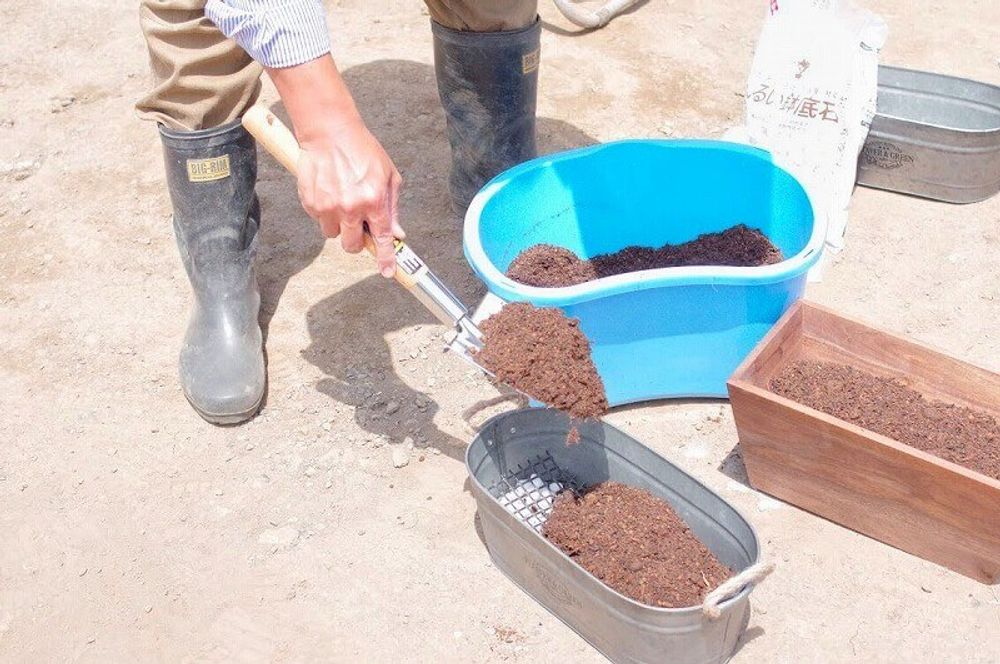 軽石の上にさらにネットを置いて(石と土が混ざるのを防ぐため)土を入れます。土は市販の野菜用やハーブ用などで大丈夫とのことでした。これでプランターの準備は完成!