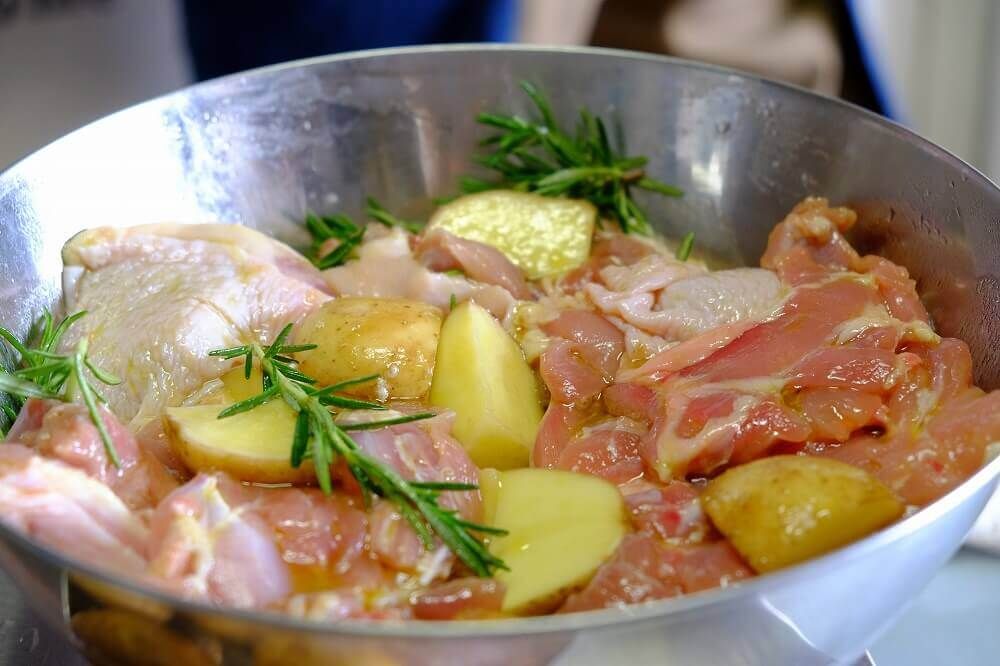 続いてはお肉料理にあうローズマリーを使います。前日から鶏肉とジャガイモに塩とローズマリーとオリーブオイルを入れて漬けこんでくださっていました。