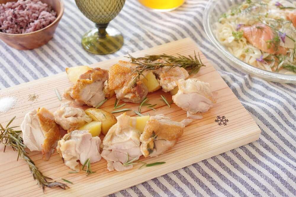 フライパンで皮目によく焼き色をつけてからオーブンで焼きます。火の通りをよくするために、じゃがいもを並べてその上に鶏肉を置くといいそうです。皮がパリッとしていて美味しそうですよね。