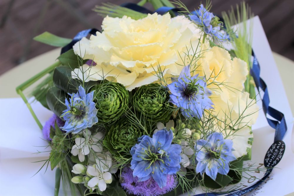 淡いブルーやグリーンの花が相性良く、フレアホワイトが映えますね♪