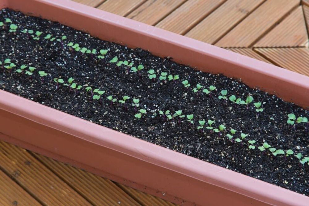 ①プランターでの栽培なら、種を15㎝程度空けて2列にまきます(条間15㎝程度)。