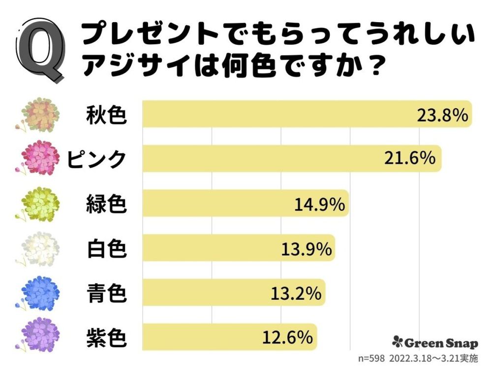 紫陽花にもいろんな花色がありますが、そのなかでも、もらってうれしい人気の花色はどれか、GreenSnapユーザー598人にアンケート調査をしました。結果はこちら。