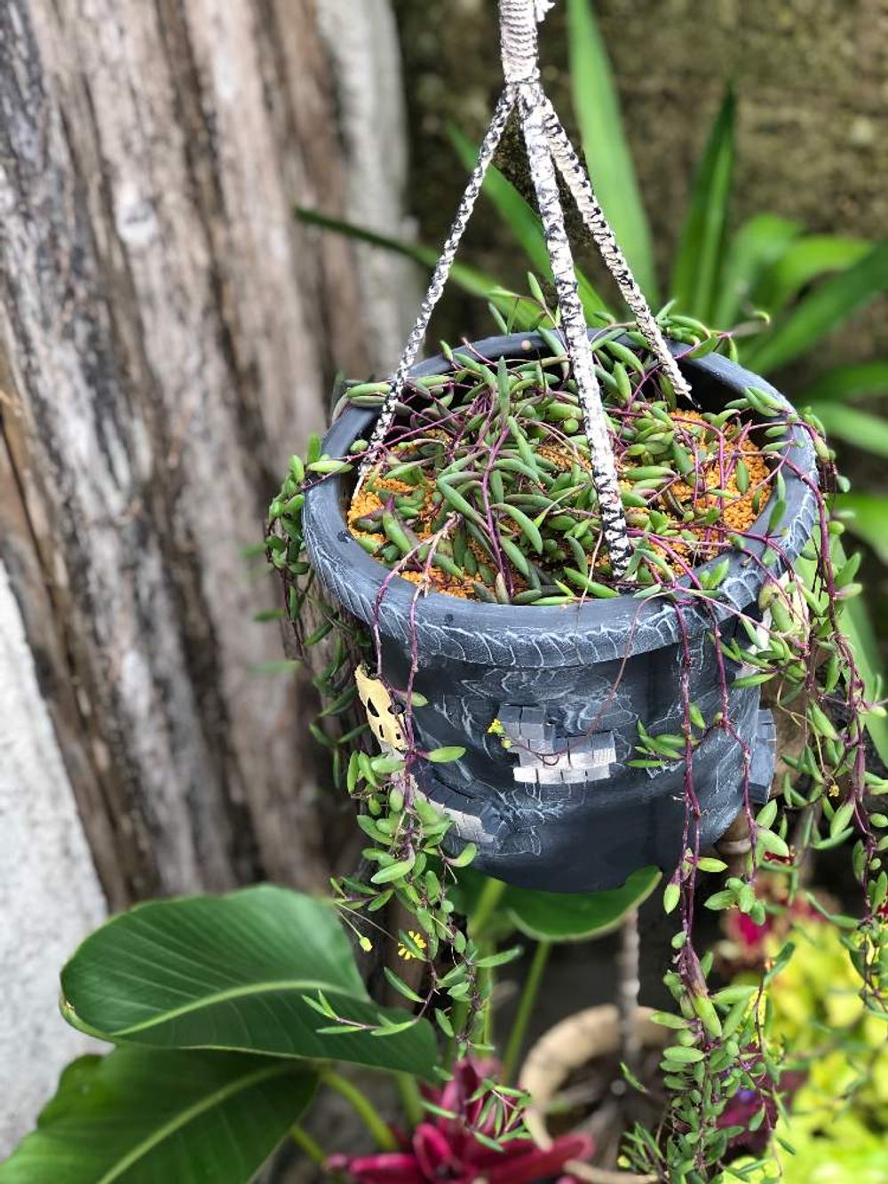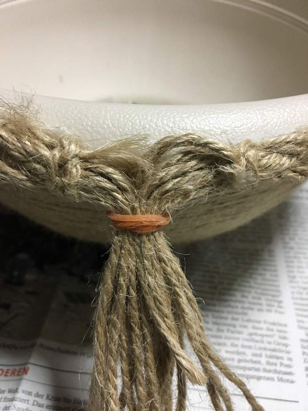 まずはタコ糸(太いやつ)で、たまたま鉢にあいてた穴にマクラメ編みしてみた(´>ڡσ)*