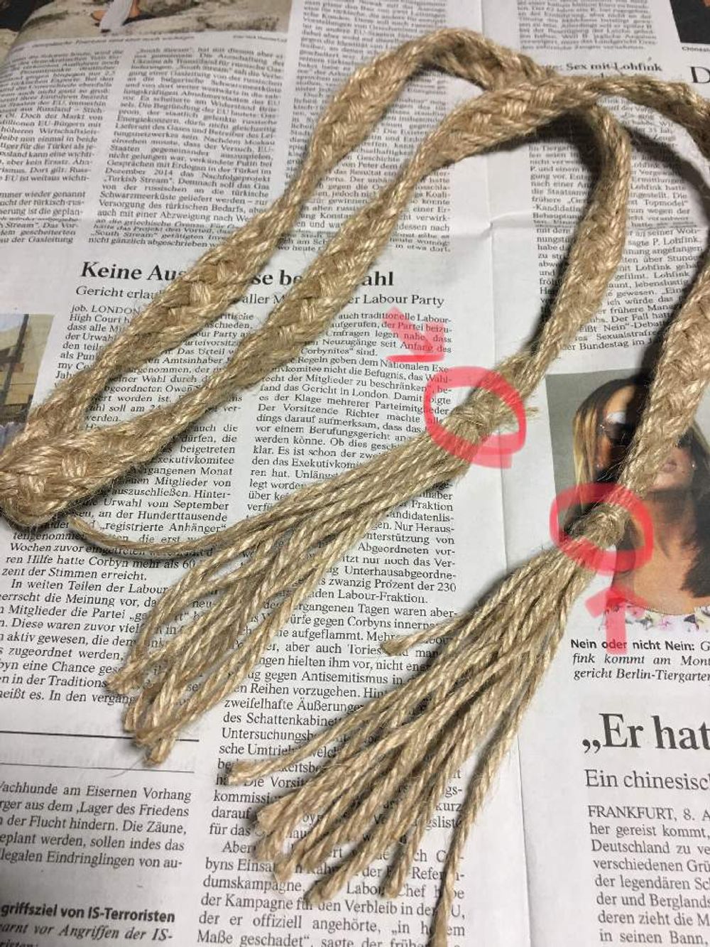 編み始めと編み終わりは、短めに切った麻紐でぐるぐると巻き、適当に結びます。