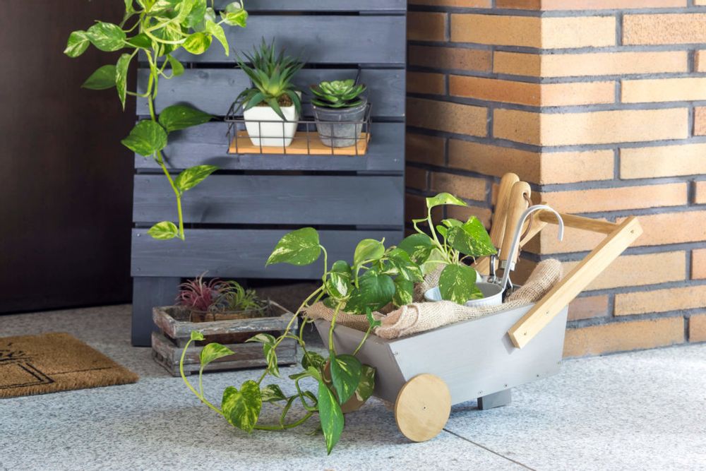 玄関や庭先など、スペースの少ないところでも高さを出して植物や小物が飾れる2段式スタンド。