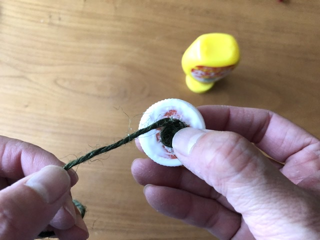 ペットボトルのキャップにボンドを塗り、ひもを渦巻きのように貼り付けていきます。