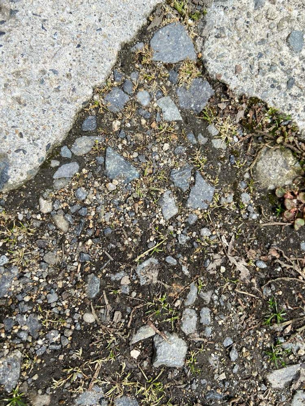 お隣との境目の道路。わずかな土にたくさんの草の芽が?