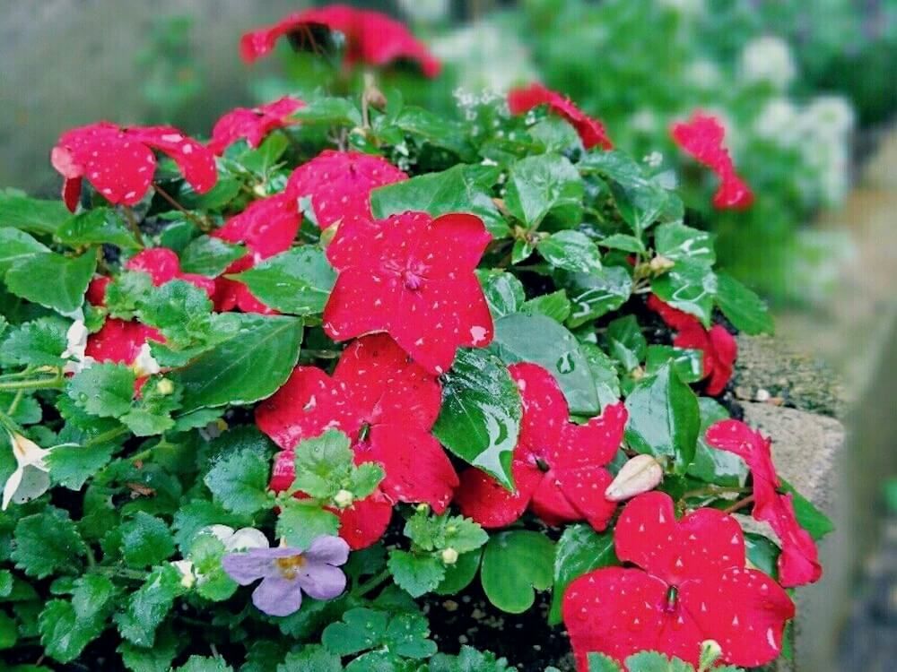 インパチェンスはとても丈夫で育てやすく、梅雨のような日当たり時間が不安定な時期でも、どんどんと成長していきます。地を這うように葉と花を茂らせ、開花期間も長いので、花壇をカラフルに賑わしてくれます。