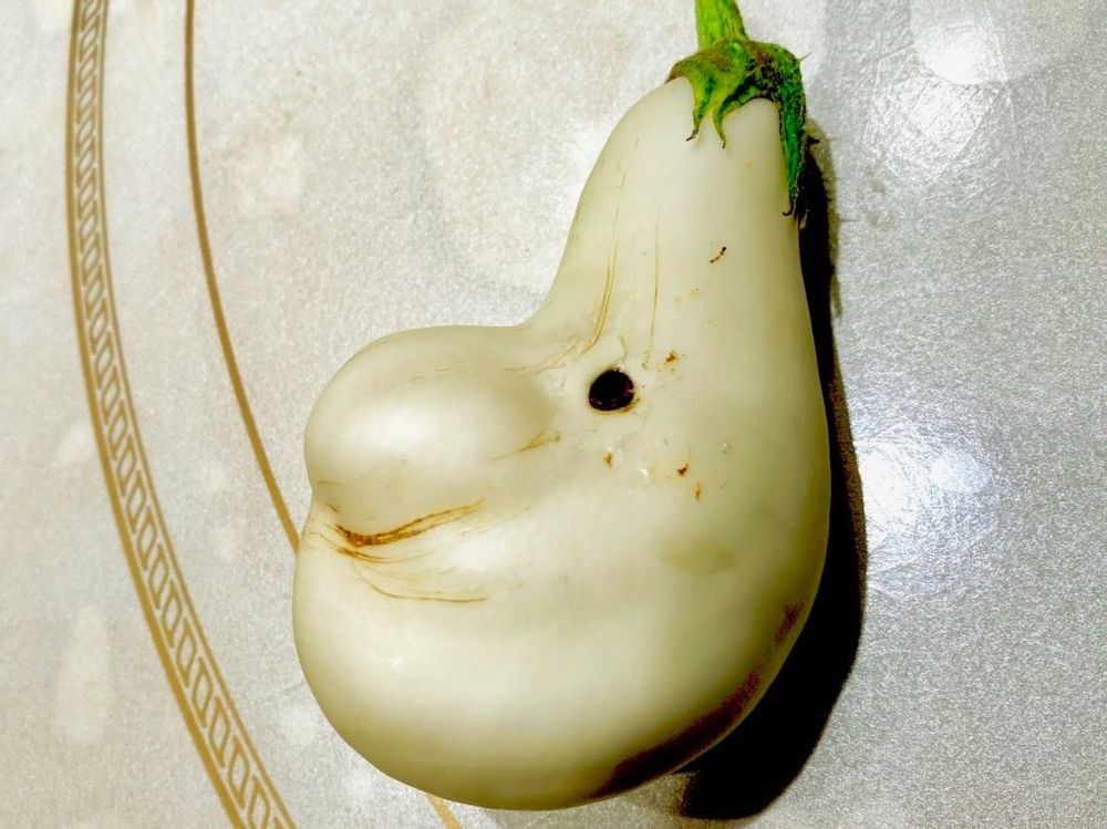 おじさん?子供?どちらに見えますか?白ナスが変形してできあがったようですが、しっかり目鼻口があって、おもしろい!笑