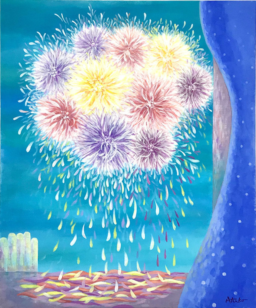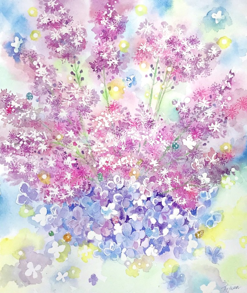 ピンクと藤色のアレンジが爽やかなお写真ですね。これをモチーフに青山瑩さんが描いた作品は、淡いながらも晴れ晴れとした色使いがステキな絵画になりました。ファンタジックでキラキラと光るような、かわいらしい作品ですね。