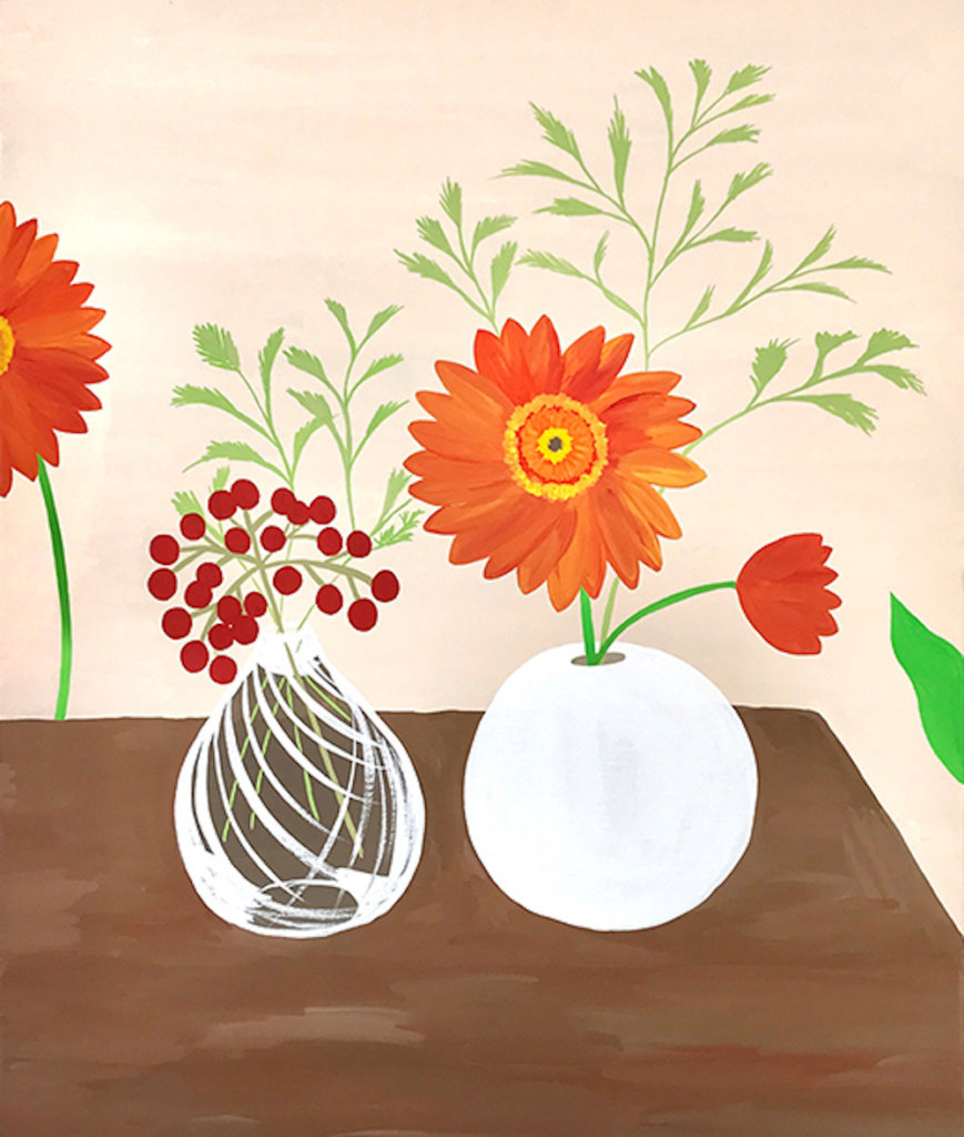 もとの写真は、キスゲのパックリと開いた花びらが晴れ晴れしいアレンジメントですね。これがKmariさんの手にかかると、ポップでカジュアルなタッチの絵に生まれ変わりました。北欧インテリアにも合いそうな、シンプルで温もりのある色使いもステキですね。