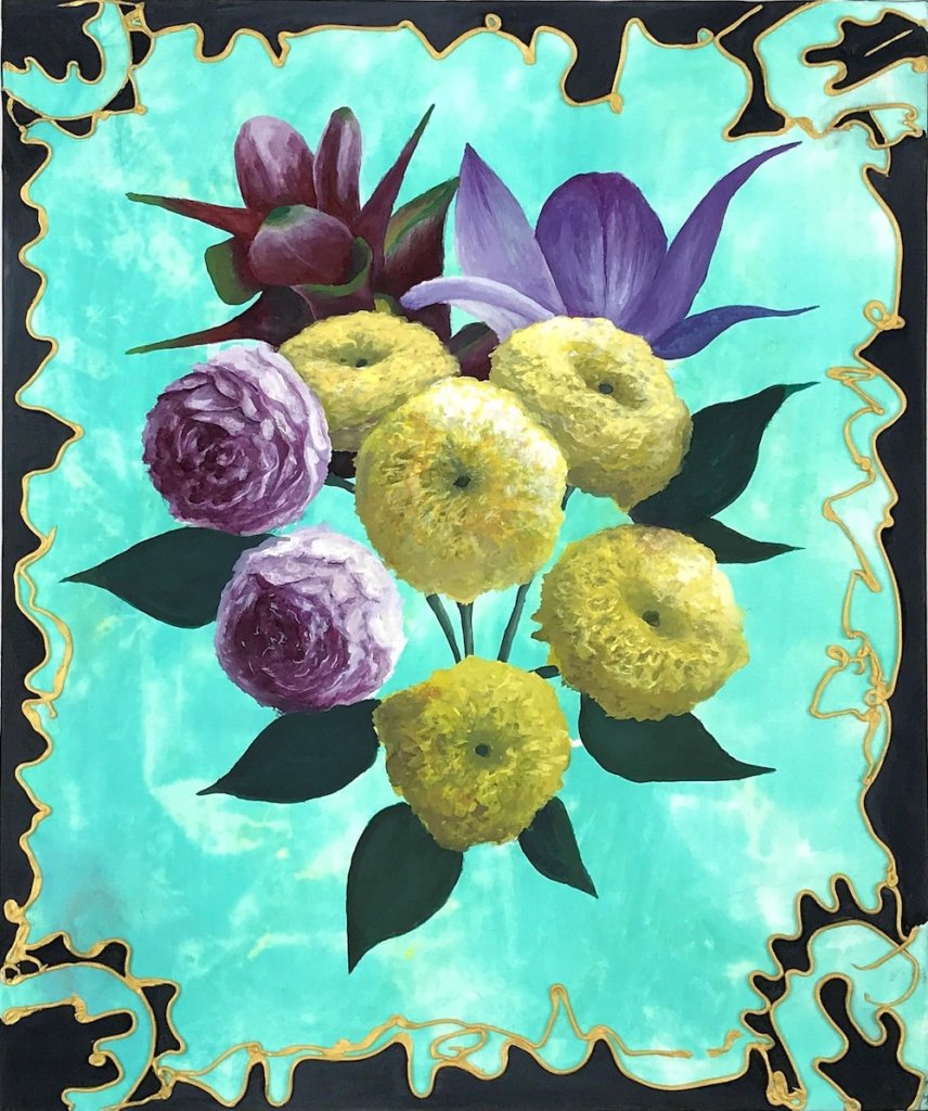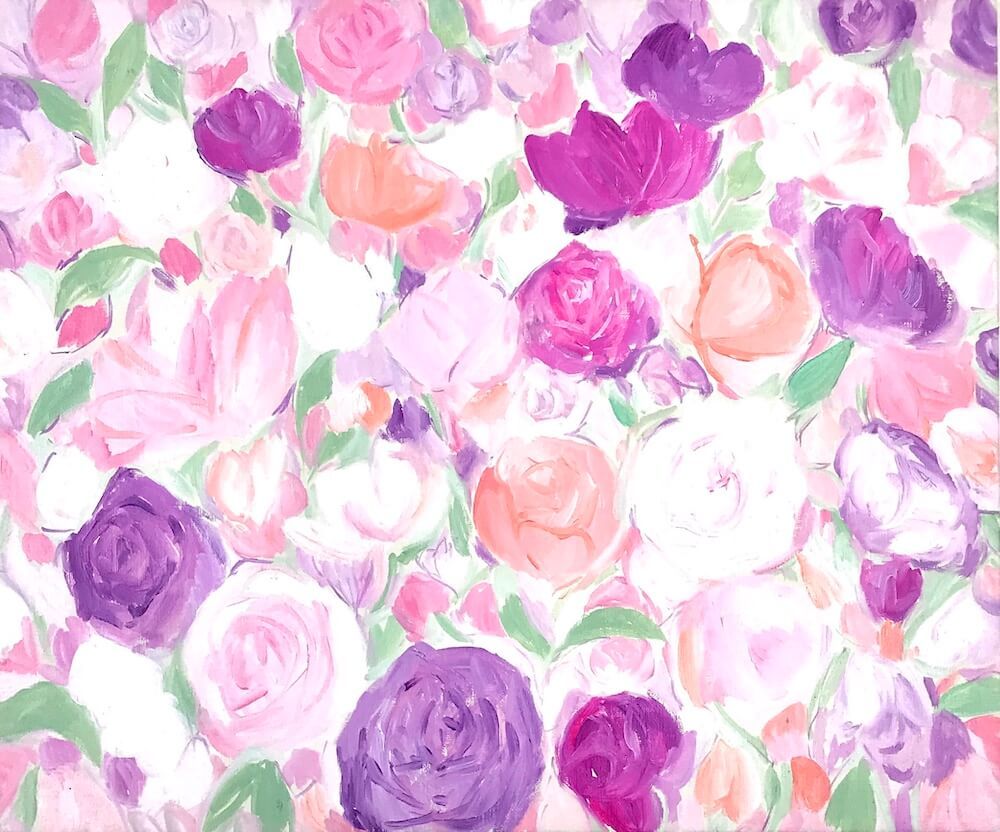 ピンクや紫のバラが優雅なアレンジメントをモチーフに、川西郁美さんが描いたのは、きらびやかで美しい色使いの作品です。端いっぱいまで描かれたバラの花、お部屋に飾れば空間がぱっと華やぎそうですね!