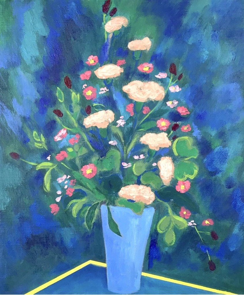 もとの写真は、庭の花を摘んで大雑把にいけたような、けれど絶妙なバランスと色使いがステキなアレンジメントですよね。これをモチーフにRmooさんが描いたのは、アンティークな色使いと質感がステキな作品です。落ち着いた存在感でどんなお部屋に馴染みそう!