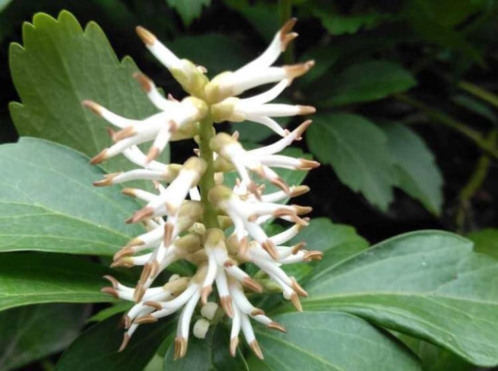 フッキソウ(富貴草)は、ツゲ科フッキソウ属の常緑矮小低木です。草丈は20cm前後に育ち、地面を這うように横に広がっていきます。葉は鋸刃で、縁にギザギザがあり、厚みがあります。耐寒性・耐暑性の両方を兼ね備えており、一年中、葉を楽しむことが出来ます。