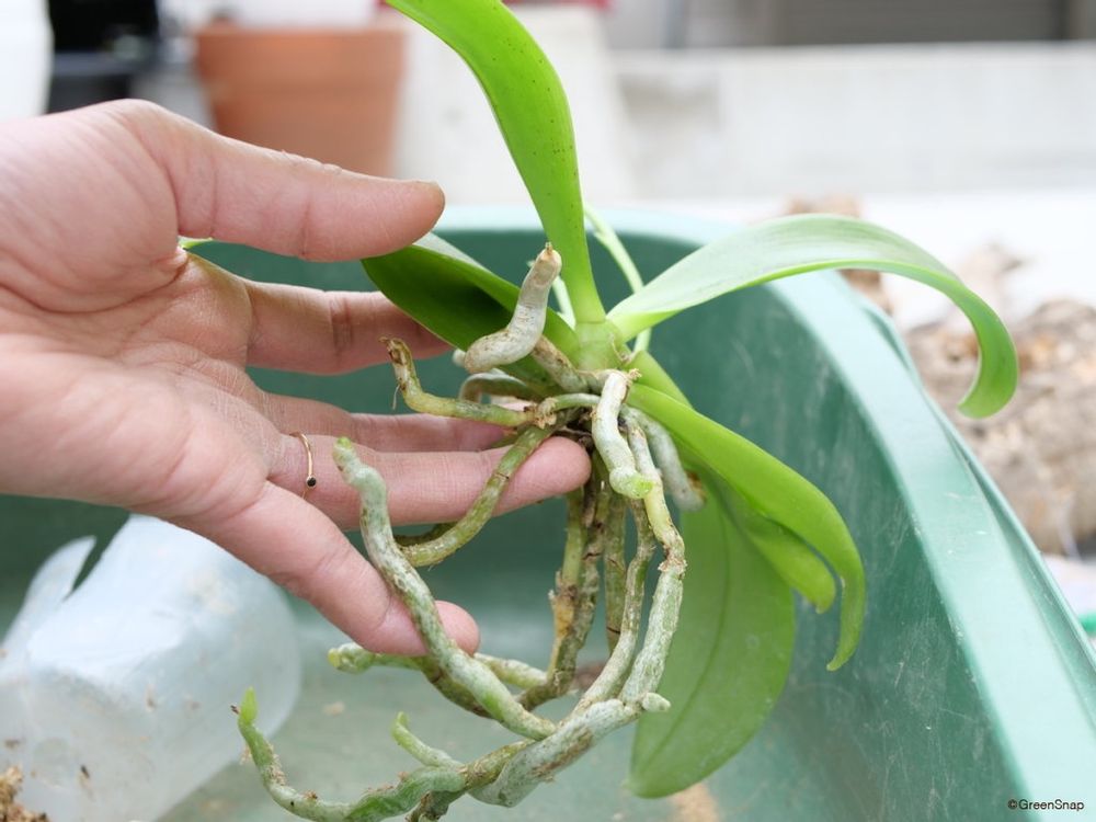 先述と同じ方法でポットから出して、古い水苔を取り外し、傷んだ根や長い根を整理しておきます。