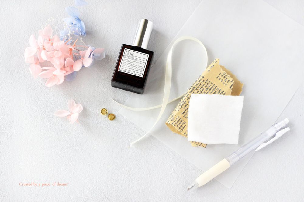 サシェの中身は香水かアロマオイル(フレグランスオイル)がおすすめです。エッセンシャルオイル(精油)より香りが長続きします。