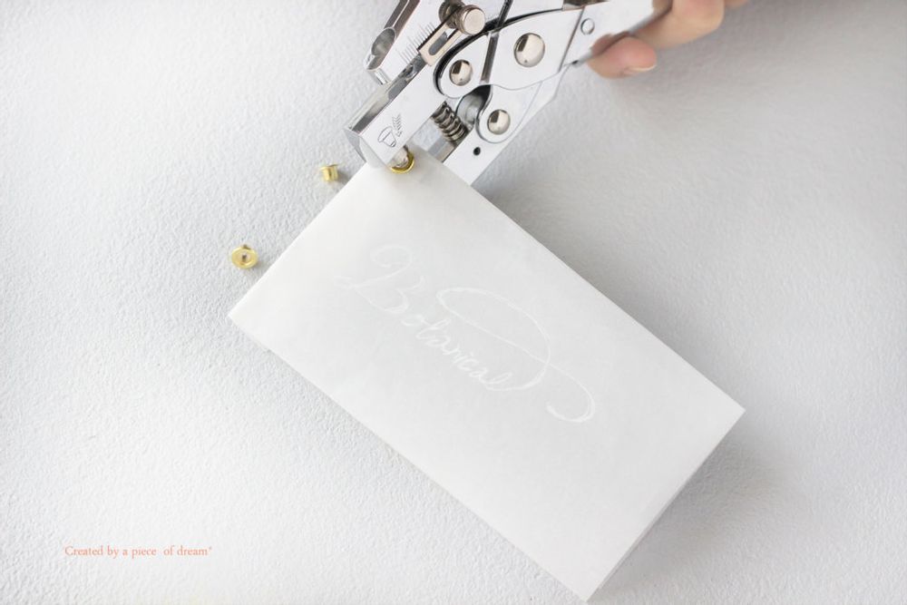 最後に袋の端を折って、ハトメにリボンを通したら完成です。心配なようであれば接着剤で折り口を止めておきましょう。