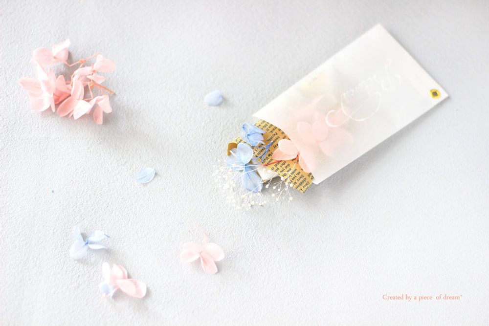 コットンがそのまま透けないよう包装紙にはさみ、文字の描いた面側にプリザーブドフラワーが透けるようにのせて、トレーシングペーパーの袋の中に入れます。